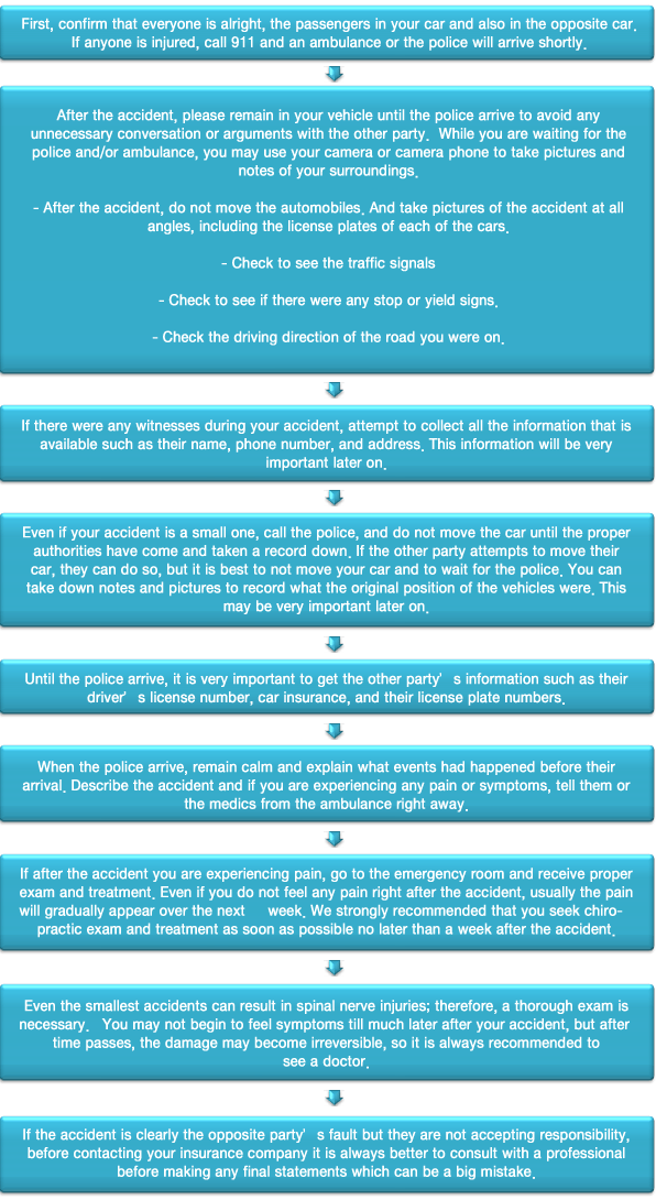 ![]() Being in an automobile accident can be a much unexpected event. It can happen to even the safest of drivers. As long as you take the correct steps afterwards, there is nothing to worry about. If you have recently been involved in an auto accident and do not know how to handle the situation, please contact us. ![]() Tip Even if the opposite party does accept responsibility for the accident, still do not forget to take down notes and pictures of the accident. Sometimes the other driver will accept responsibility for the accident at the scene, and then when they call their insurance company, tell them a different story. Also collect their information such as their driver license, registration, car insurance, and their license plates. When you check the license, registrations, and insurance, make sure all the names match. If the name is not the same, write down the different names and the relationship between them. Do not say that it is your own fault or take responsibility at the scene. This may cause confusion later. After an accident, your insurance company as well as the other party's insurance company will contact you for a recorded statement. Many patients believe their insurance will be on their side, but this is not the case. Your recorded statement will be shared with the other party's insurance company as well, so always consult with a professional before doing the recorded statement. SAFETY MANAGEMENT When the police officer arrives after the accident, make sure that they record all the correct information, confirming that the names on the vehicle registration and the car's insurance are the same. If you have an emergency cone or triangle in your vehicle in case of an accident this will enable you to exit your car more safely. If you do not have a smart phone, it is recommended that you carry in your car a disposable camera so that you may be able to take pictures of the accident. Follow Up If you are experiencing pain after a traffic accident, under the Maryland Automobile Insurance PIP (Personal Injury Protection), and under Virginia Medical Payment you are covered for medical treatment and wage loss. In the case that the opposite party has not accepted responsibility, you do not have to wait for their consent to begin receiving medical treatment. When you arrive at our facility, we will connect you with a reliable lawyer whom we have worked with before, help with insurance processing, and if needed, refer you to other orthopedic, neurosurgery, internal medicine, and oriental medicine doctors. If you need a translator or help with communicating to other parties, we are here to assist you in claiming your accident, paperwork, wage loss compensation, inspections, emergency room costs, and other various tasks. |